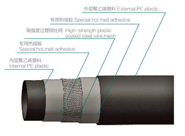 Steel wire reinforced thermoplastics ( PE ) composite pipe is anew kind on pipe whose strengthened skeleton is spirally winded around high-tensile steel wares in positive and negative direction, and its Inner and outer side are made of HDPE. The pipe is connected by modified polyethylene adhesive resin. it is constructed through the continuous extrusion. Pipes are connected through electrical hot melt and connection strength is in concordance with the pipe body.